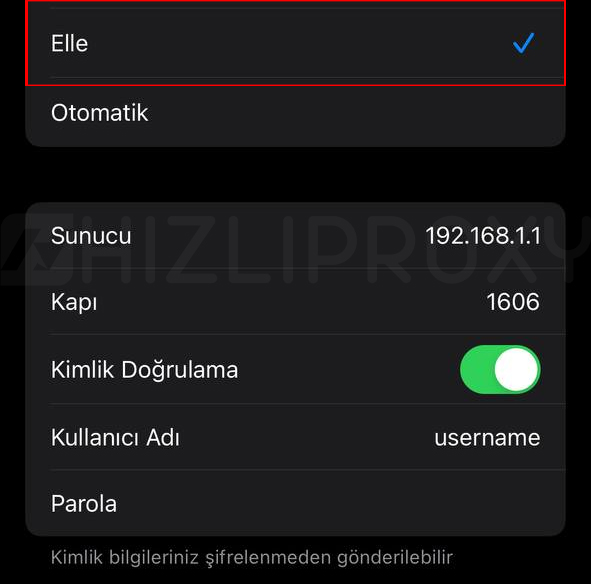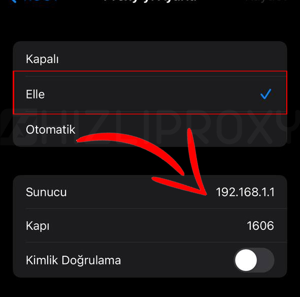 "HTTP PROXY" veya "HTTPS PROXY" seçeneklerinin yanındaki "Otomatik" yerine "Elle" seçeneğini seçin.
