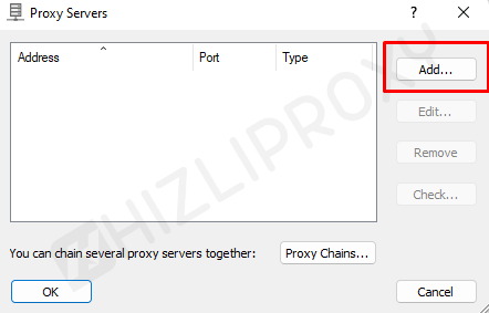 - "Proxy Servers" penceresinde "Add" düğmesine tıklayın.