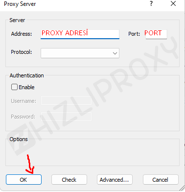 - Eğer proxy sunucusu kullanıcı adı ve şifresi gerektiriyorsa, "Authentication"